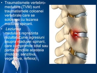 Traumatismele vertebro-medulare implică leziuni ale măduvei spinării rezultând din fracturi sau dislocări ale coloanei vertebrale cauzate de accidente, căderi sau osteoporoză. Aceste traumatisme pot produce diverse stări neurologice, de la comotie medulară la secțiune medulară, fiecare având semne și simptome specifice. Examinarea clinică detaliată și tratamentele imediate sunt esențiale pentru gestionarea pacienților cu astfel de leziuni.