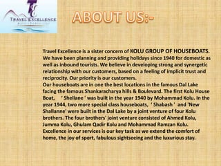 Travel Excellence, part of the Kolu Group, has been planning holidays since 1940, specializing in houseboat accommodations on Dal Lake and a variety of travel packages across Jammu, Kashmir, and Ladakh. The company emphasizes customer service, with 24-hour assistance and fully automated operations to ensure high-quality experiences. Their offerings include guided tours, sightseeing, and various themed travel packages, aiming to provide a memorable and comfortable experience for both domestic and inbound tourists.