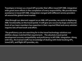 Travelopro offers a range of API integration services to simplify the technical aspects of travel product bookings for agents, allowing them to focus on their business. Their comprehensive APIs provide access to various services including hotel bookings, flight integrations, car rentals, and transfer solutions, aimed at enhancing consumer experience and operational efficiency. By leveraging these APIs, both small and large travel agencies can offer competitive services and a diverse selection of travel products to their customers.