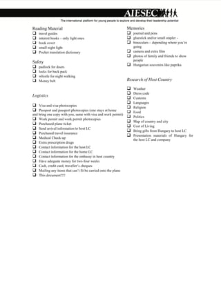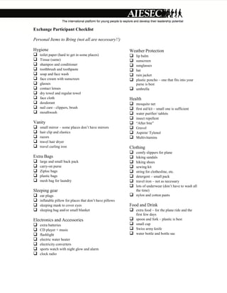 The document provides a lengthy checklist of personal items that an exchange participant may want to bring for their trip, organized into categories such as hygiene, vanity, sleeping gear, electronics, clothing, food, reading materials, safety, memories, and logistics. It includes suggestions for both essential items like toiletries and less necessary options like travel irons. Logistical items cover documentation, finances, contacts, and cultural research about the host country.