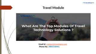 Travelopro is your trusted partner in delivering world-class custom travel technology module for the travel industry. With our deep expertise and dedication, we provide innovative and scalable software that increases operational efficiency and customer satisfaction. The travel module plays an important role in the travel and tourism sectors. It is revolutionizing the way travel companies target travellers, offering all travel services—hotels, flights, cars, cruises, tours, transfers, and activities—on an online platform to plan their entire trip within minutes and improve the visitor experience. Travel technology modules go with multi-currency, multi-language, quotation management, accounting, and reporting. For more details, Pls visit our website: https://www.travelopro.com/travel-module.php