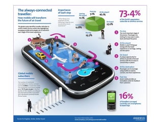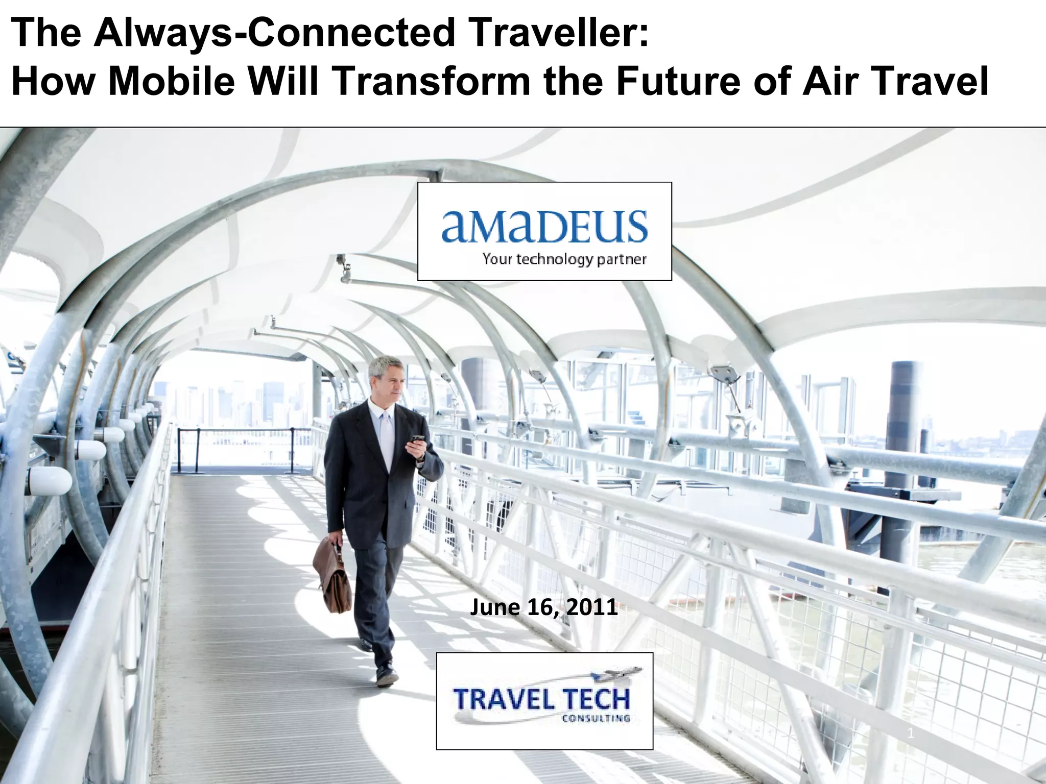 The document discusses how mobile technology is transforming air travel for always-connected travelers. It finds that younger, frequent flyers have greater smartphone usage for tasks like booking. While mobile check-in is still niche, Asia shows promise for expansion. Social media is also impacting travel markets worldwide. The document outlines airlines' mobile strategies and challenges in keeping up with platform fragmentation and innovation, but also opportunities to enhance customer loyalty and drive new revenue through mobile capabilities.