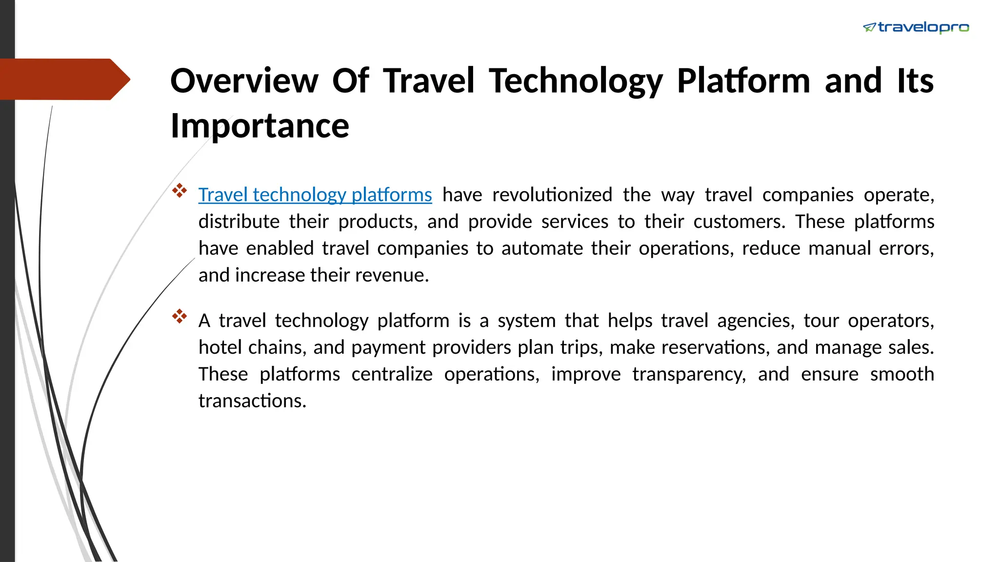 Overview Of TravelTechnology Platform and Its Importance  Travel technology platforms have revolutionized the way travel companies operate, distribute their products, and provide services to their customers. These platforms have enabled travel companies to automate their operations, reduce manual errors, and increase their revenue.  A travel technology platform is a system that helps travel agencies, tour operators, hotel chains, and payment providers plan trips, make reservations, and manage sales. These platforms centralize operations, improve transparency, and ensure smooth transactions.