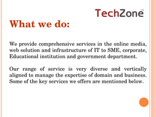 The document outlines the services provided by a digital marketing and technology agency, emphasizing their expertise in online media, web solutions, and IT infrastructure for various sectors including corporate, educational, and government. Key offerings include website solutions, digital marketing, social media management, and customized application development. The agency aims to deliver high-quality technology and media services, leveraging over ten years of industry experience and partnerships with leading technology vendors.