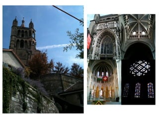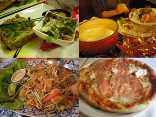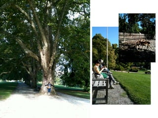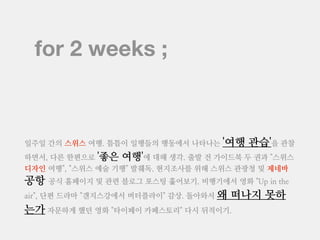 The document outlines a 2 week trip that was split into two parts. The first part describes why the author couldn't go for 2 weeks but doesn't provide details. The second part of the trip involved a 7 day trip with 6 people from Switzerland to Paris and Geneva, including details about flights and transportation between cities as well as a hotel stay. The trip included time in Geneva and Lausanne before concluding with a flight home.