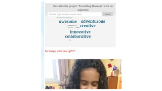 This document describes an eTwinning project between a primary school in Crete, Greece and a primary school in Meaux, Paris, France called the "Travelling Museum". The goal of the project was for students to collaborate to create traveling kits with museum objects and materials about local museums in their countries. Students researched local museums and created authentic crafts and exhibits. The briefcases would then travel between the countries so students could learn about each other's museums and cultures. The schools aimed to create an ongoing museum school network through this project.