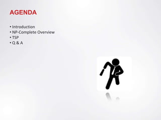 The document discusses the Travelling Salesman Problem (TSP), which aims to find the shortest route to visit each city in a list exactly once and return to the origin city. It describes TSP as an NP-hard problem, belonging to the complexity class NP-complete. The document provides background on TSP, explaining it cannot be solved in polynomial time using techniques like linear programming. While an efficient solution to the general TSP has not been found, there are approximation algorithms that provide near-optimal solutions.