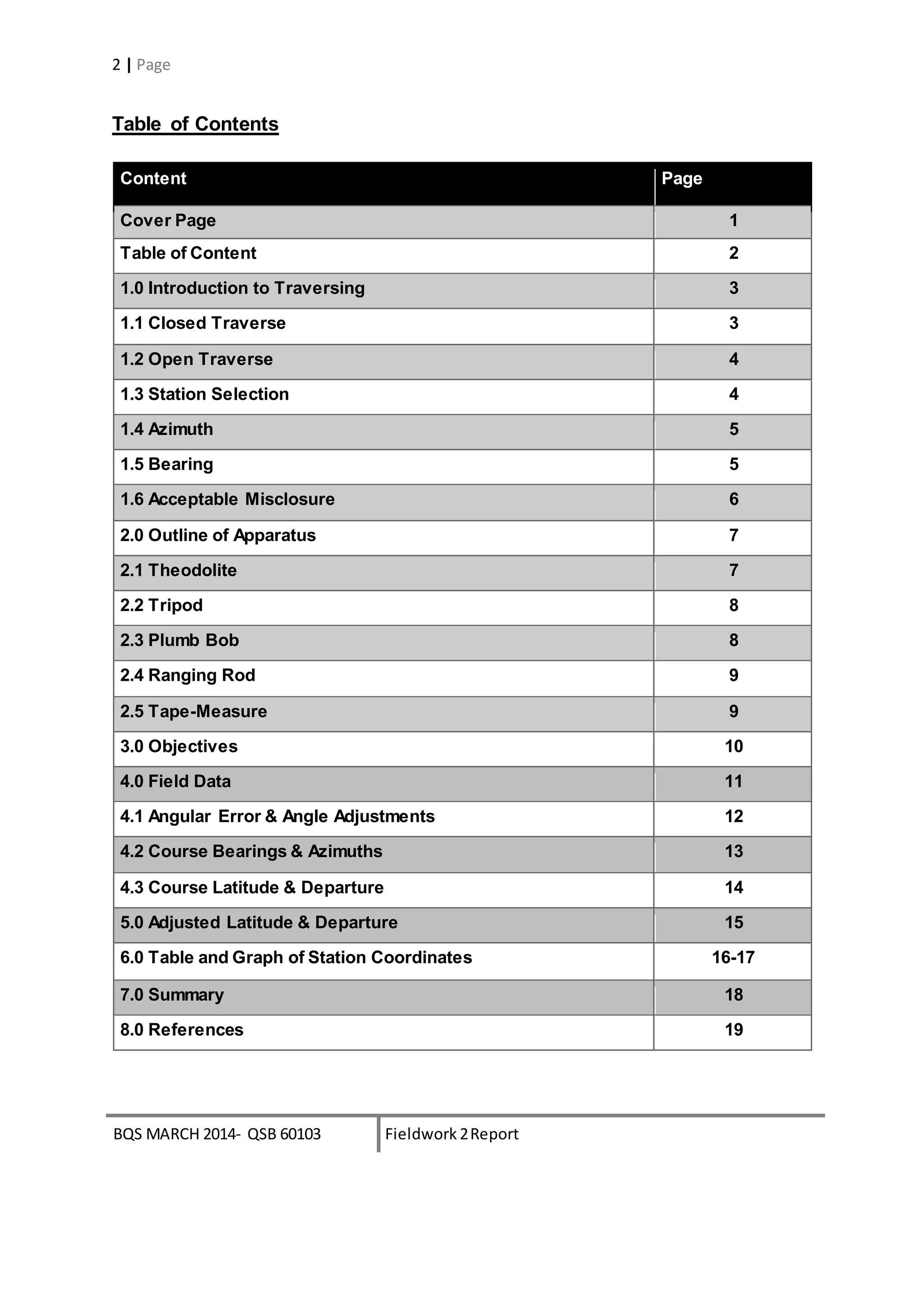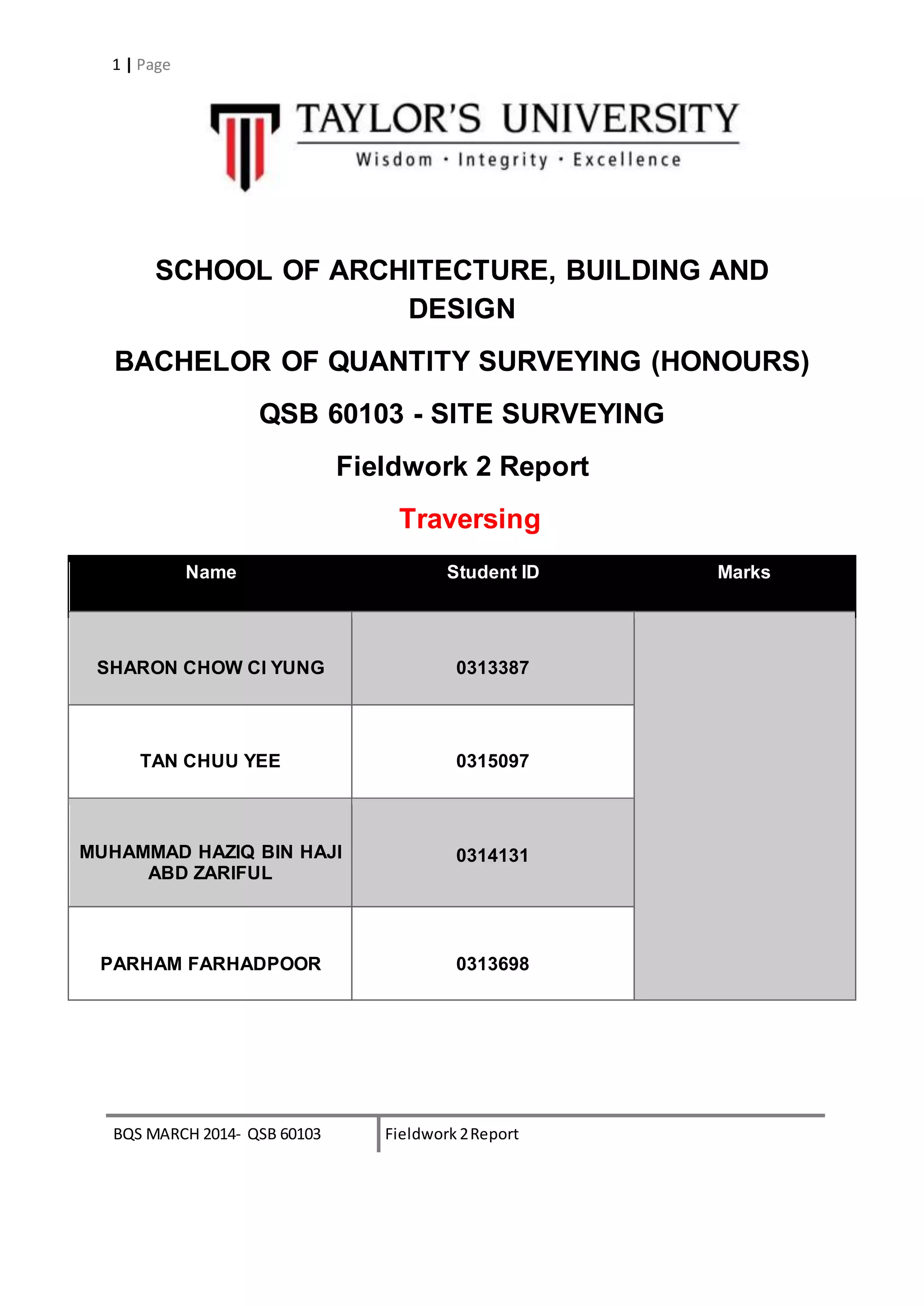 The document summarizes a fieldwork report on traversing. It includes an introduction to closed and open traverses, station selection criteria, and apparatus used including a theodolite, tripod, plumb bob, ranging rods and tape measure. Field data is presented showing the measured angles. Angular errors are calculated and angle adjustments made. Course bearings, azimuths, latitudes and departures are determined. The traverse is checked for accuracy and found acceptable. Latitude and departure corrections are applied using the compass rule. Adjusted station coordinates are presented in a table.