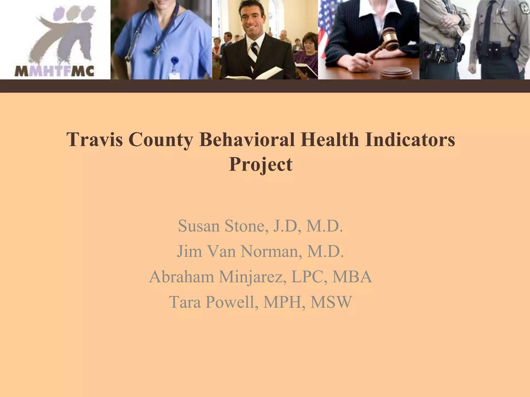 This document discusses behavioral health indicators in Travis County and initiatives to address criminal justice and mental health issues. It outlines the formation of a Mayor's Mental Health Task Force in response to a tragic incident and their efforts to establish collaboration between mental health organizations. Initiatives described include Crisis Intervention Teams to respond to mental health calls, specialized court programs, and a community competency restoration project. Data is presented on the success of this project and homelessness rates. The document advocates using community indicators to drive social change and outlines proposed indicators to track, such as rates of individuals with mental illness in jail and psychiatric hospital readmissions. Contact information is provided for following up on these efforts.