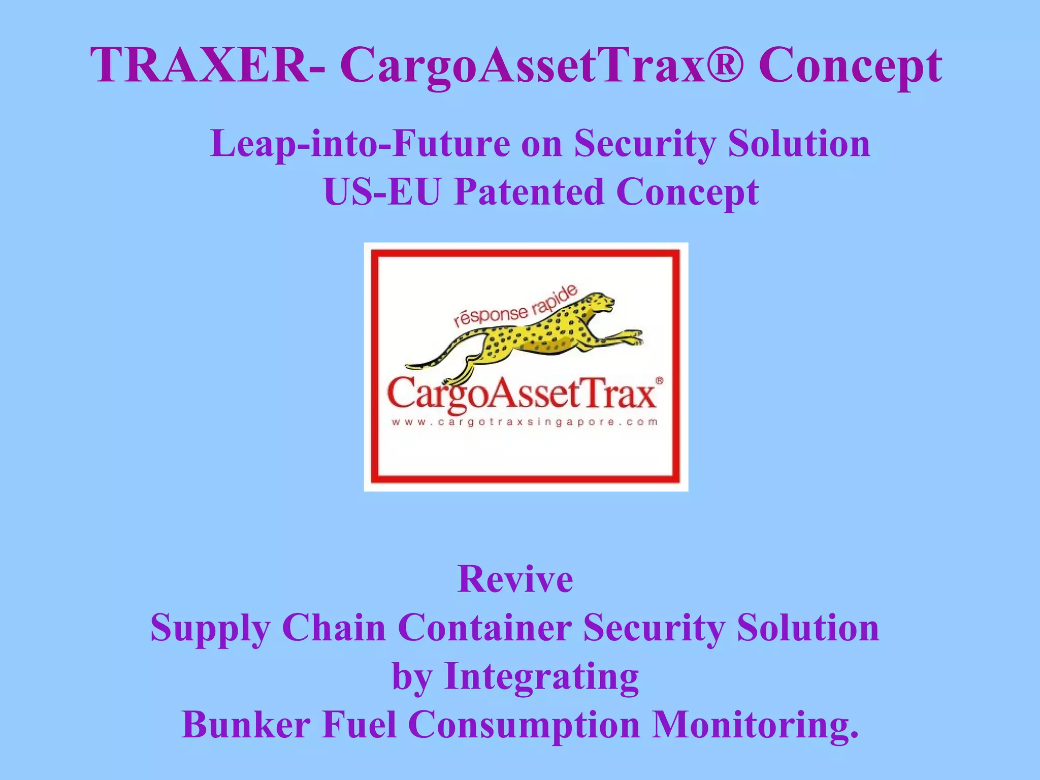 The Traxer-CargoAssetTrax® concept introduces a patented security solution for supply chain container monitoring by integrating bunker fuel consumption monitoring, addressing issues faced by ship owners and operators regarding ROI. It aims to reduce losses from theft and fraud with a comprehensive monitoring system available 24/7 for a low cost, benefiting various stakeholders including ship owners, customers, and investors. The initiative seeks additional investment participation, estimating a funding requirement of $5-10 million primarily in the USA and Singapore.