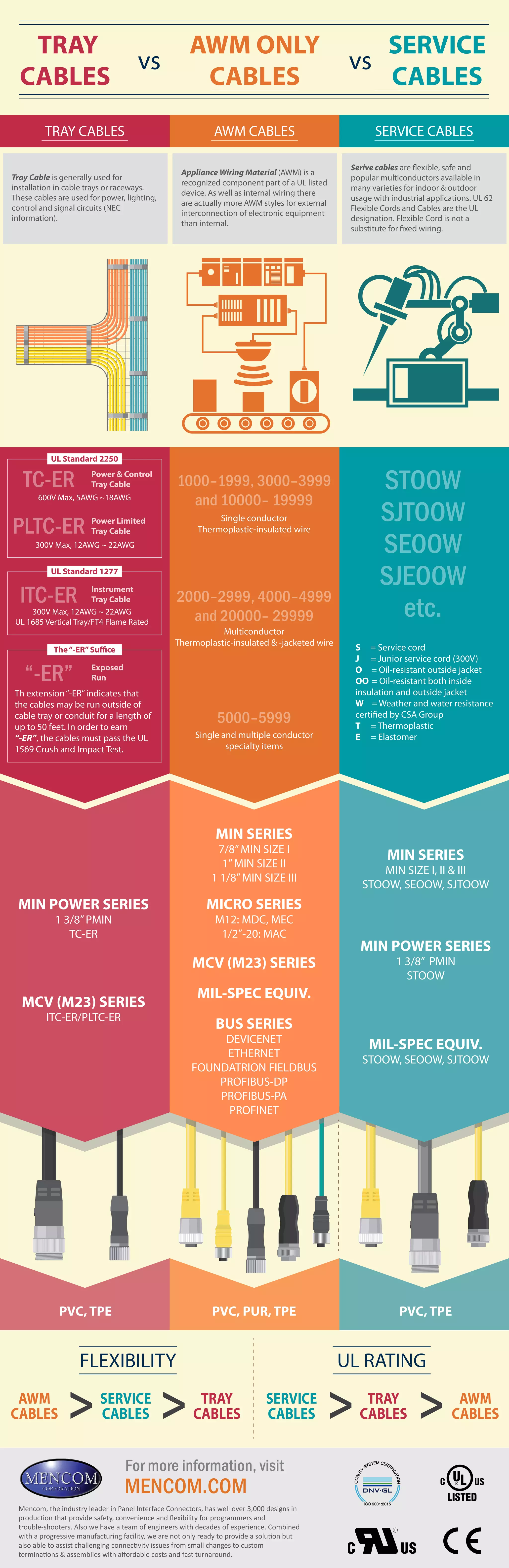 The document provides an overview of various types of electrical cables, including AWM, tray cables, and service cables, focusing on their applications, flexibility, and UL ratings. It emphasizes the importance of compliance with safety standards and the different designations for insulation and environmental resistance. Additionally, it mentions Mencom as a leader in panel interface connectors, offering a wide range of custom solutions and support for connectivity challenges.
