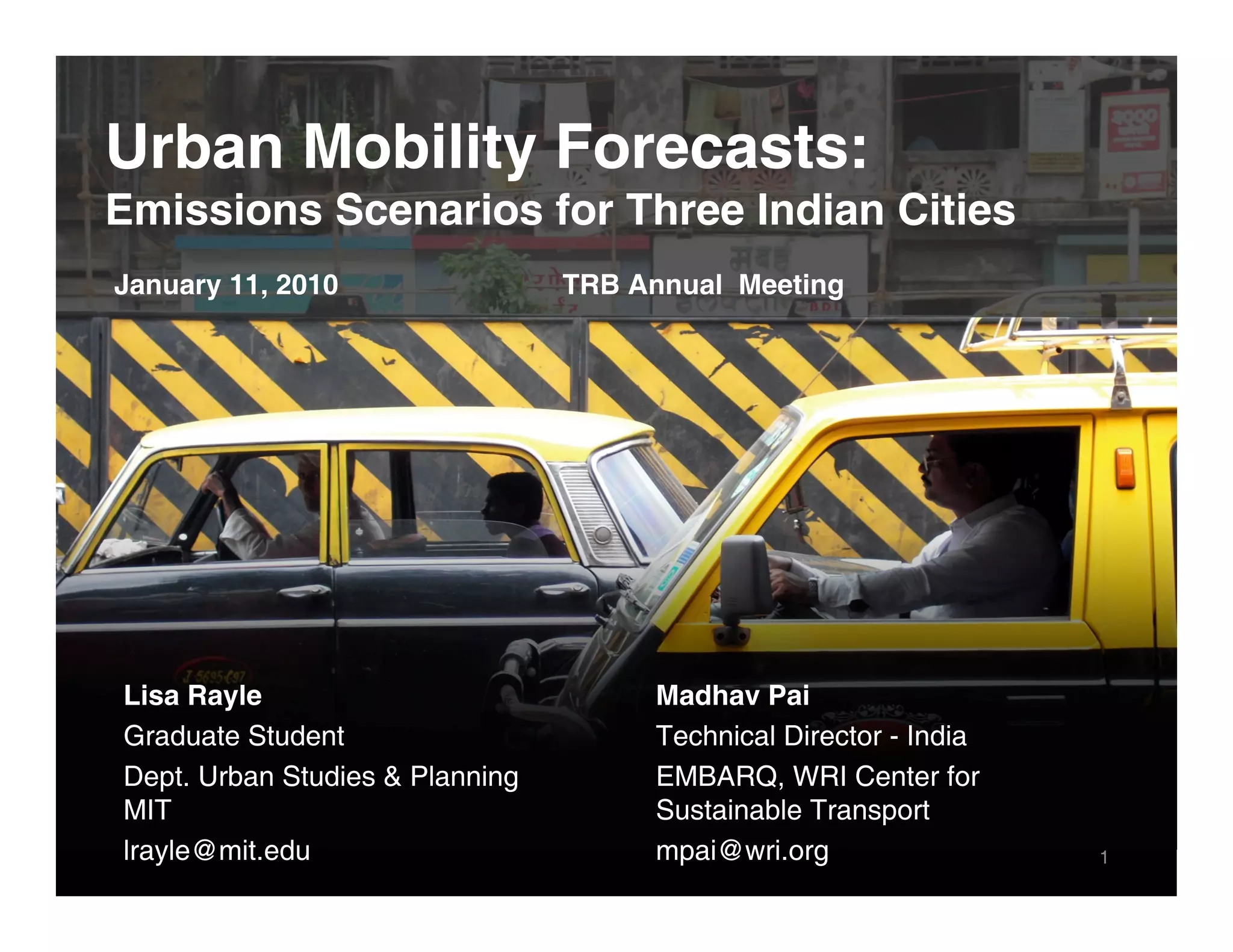 This document summarizes a study that estimates future greenhouse gas emissions from urban travel in three Indian cities - Ahmedabad, Mumbai, and Surat - under various policy scenarios. The researchers developed bottom-up models to forecast travel activity and mode share out to 2040 based on population and income growth as well as different policy approaches. Their analysis found that emissions could be 6-10 times higher than current levels by 2040 under an "automobility" scenario but only 2-4 times higher under a "sustainable transport" scenario that prioritizes public transit, walking and cycling. The scenarios demonstrate the large influence that transport and land use policies can have on future emissions levels at the city scale.