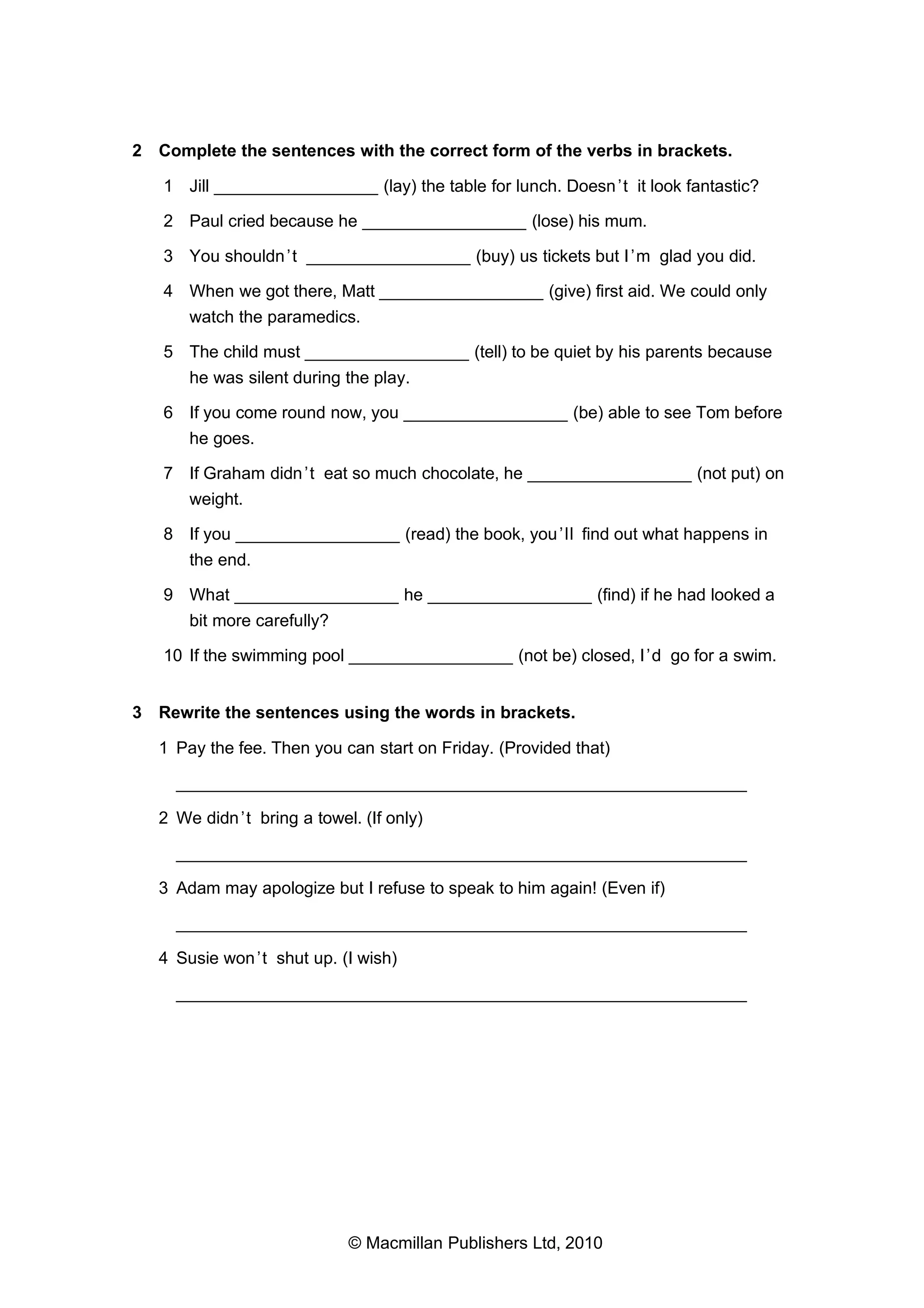This document provides grammar and vocabulary practice exercises for students. It includes multiple choice questions to complete sentences using correct verb tenses and forms. There are also exercises on rewriting sentences in reported speech, joining sentences with relative pronouns, translating sentences into another language, and completing sentences with appropriate adjectives, prepositions, compound nouns, and single words. The exercises cover a range of grammar and vocabulary topics to help students practice and improve their skills.