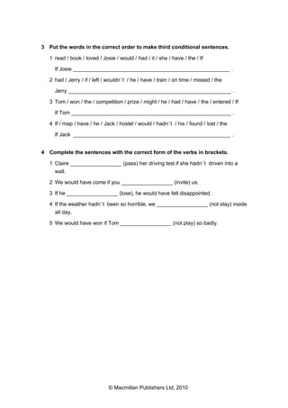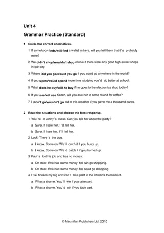 This document contains an English grammar practice test with multiple choice questions, fill-in-the-blank exercises, and other tasks focusing on conditional sentences and verb tenses. It covers topics like the third conditional, using "if" and "would" correctly, and forming conditional sentences based on different scenarios. The vocabulary section defines words like "afford", "purchase", and "discount" and has exercises matching words to definitions and completing sentences.