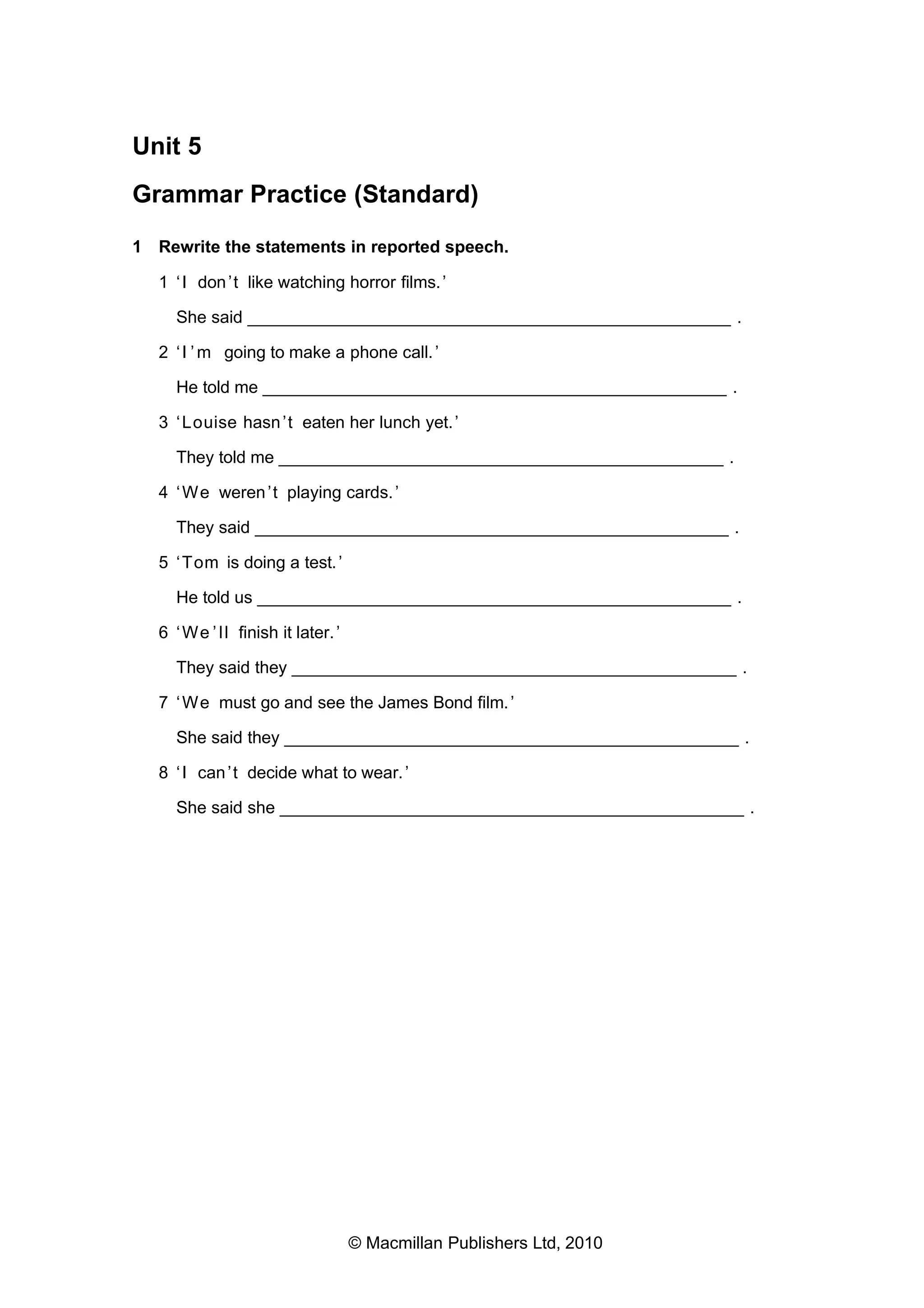 This document contains an English grammar practice worksheet divided into multiple sections. The sections include rewriting statements and questions in reported speech, completing reported speech statements, translating sentences into another language, and vocabulary practice with compound nouns, prefixes, synonyms and antonyms. The document tests a variety of grammar and vocabulary concepts related to reported speech, tenses and parts of speech.