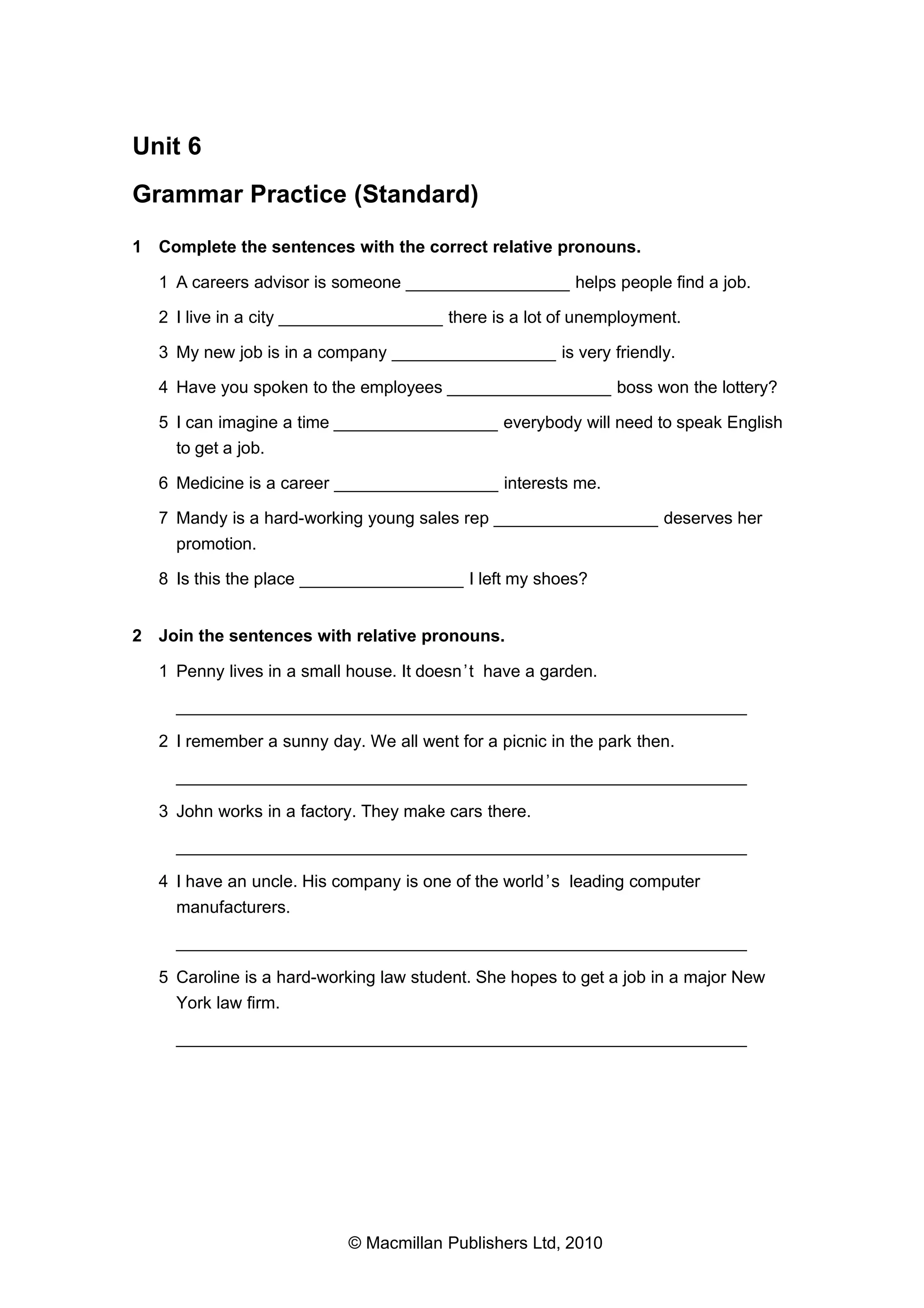 The document provides exercises to practice using relative pronouns in sentences.