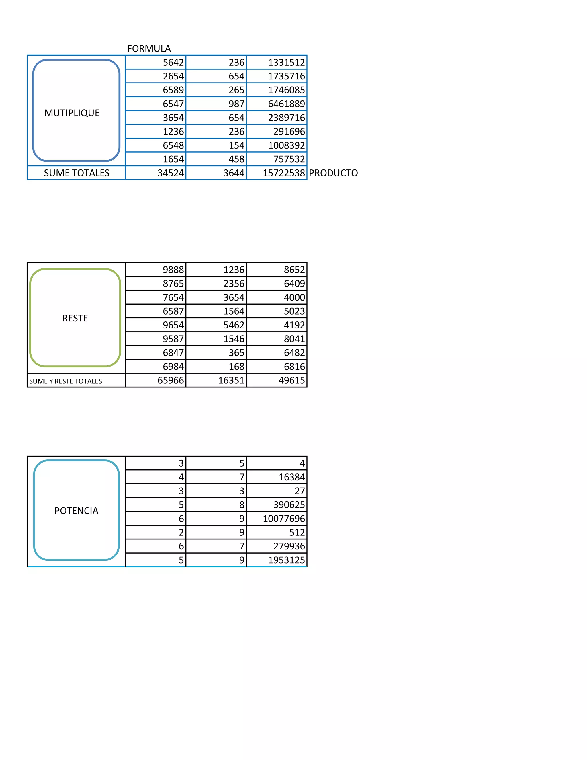 5642 236 1331512 2654 654 1735716 6589 265 1746085 6547 987 6461889 MUTIPLIQUE 3654 654 2389716 1236 236 291696 6548 154 1008392 1654 458 757532 SUME TOTALES 34524 3644 15722538 PRODUCTO 9888 1236 8652 8765 2356 6409 7654 3654 4000 6587 1564 5023 RESTE 9654 5462 4192 9587 1546 8041 6847 365 6482 6984 168 6816 SUME Y RESTE TOTALES 65966 16351 49615 3 5 4 4 7 16384 3 3 27 5 8 390625 POTENCIA 6 9 10077696 2 9 512 6 7 279936 5 9 1953125