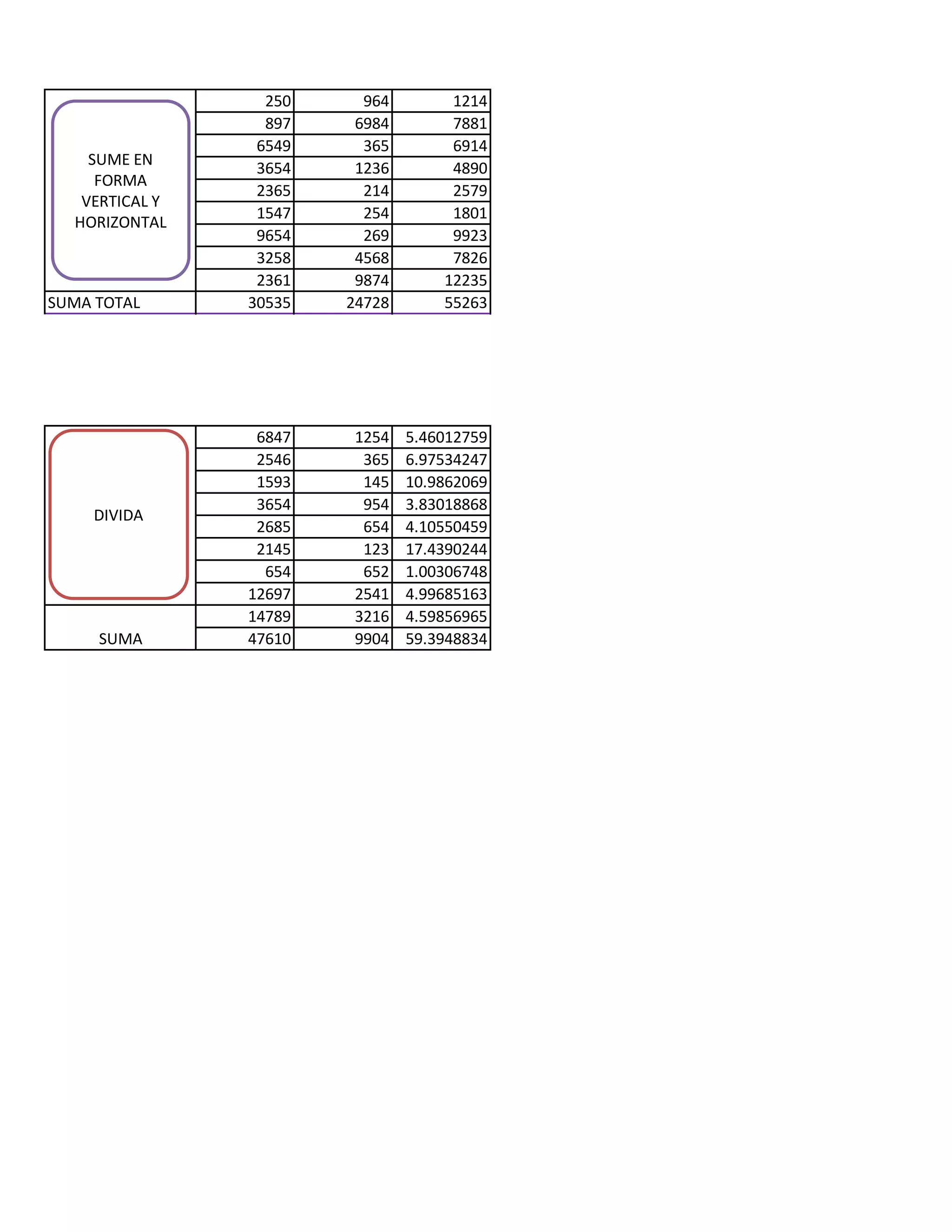 964 1214 897 6984 7881 6549 365 6914 SUME EN 3654 1236 4890 FORMA 2365 214 2579 VERTICAL Y 1547 254 1801 HORIZONTAL 9654 269 9923 3258 4568 7826 2361 9874 12235 SUMA TOTAL 30535 24728 55263 6847 1254 5.46012759 2546 365 6.97534247 1593 145 10.9862069 3654 954 3.83018868 DIVIDA 2685 654 4.10550459 2145 123 17.4390244 654 652 1.00306748 12697 2541 4.99685163 14789 3216 4.59856965 SUMA 47610 9904 59.3948834