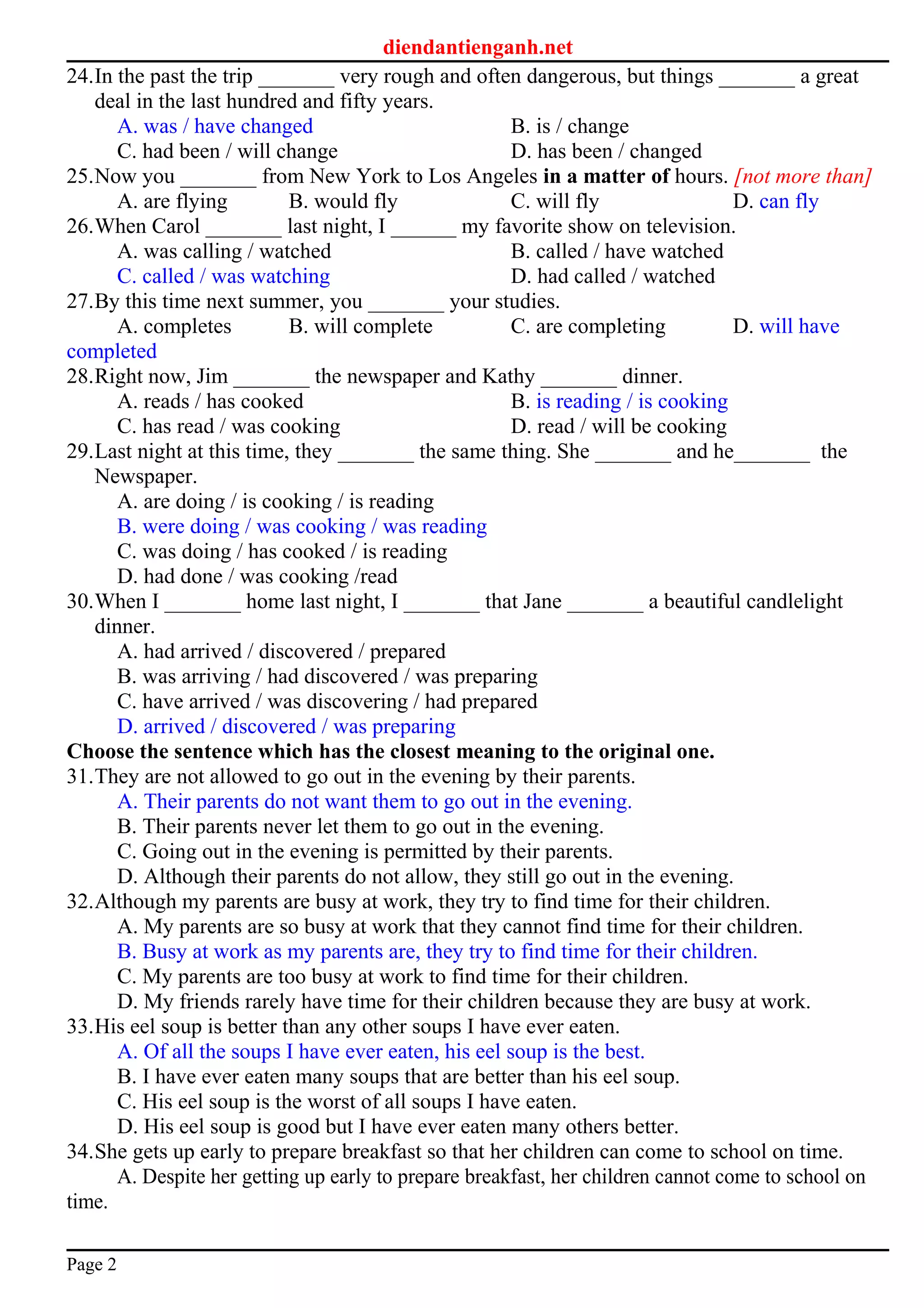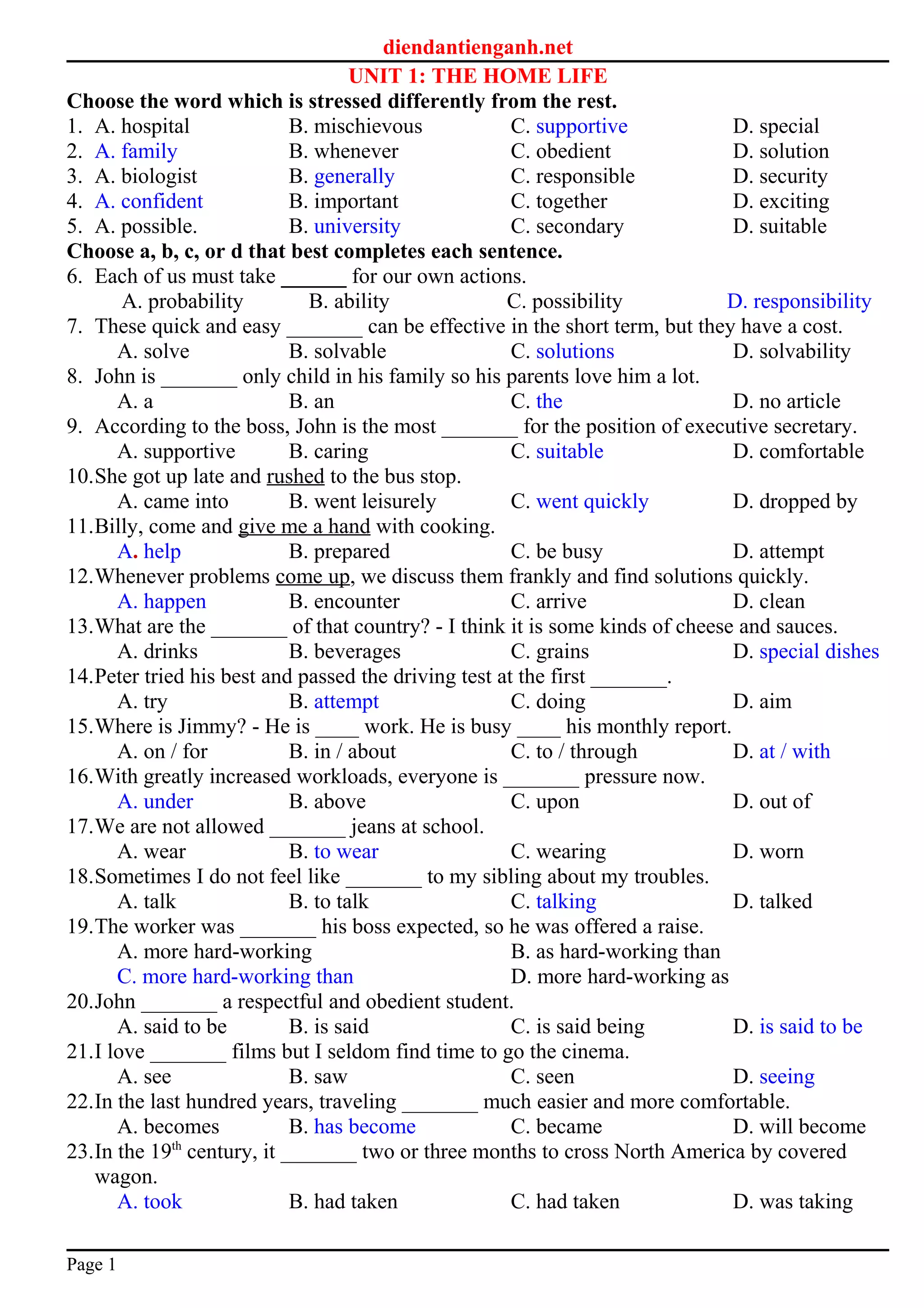 The document is a reading comprehension test containing 50 multiple choice questions about grammar, vocabulary, and the meanings of passages. It tests understanding of topics like families, home life, relationships, and past versus present situations. The questions cover parts of speech, tense, articles, prepositions, stress in words, and identifying main ideas and details in passages about people's lives and histories.