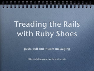 The document discusses a web conference focused on Ruby Shoes and real-time messaging, highlighting its playful and experimental nature. It warns users about potential bugs and security risks associated with the code and concepts presented. The emphasis is on caution and entertainment rather than detailed examples.