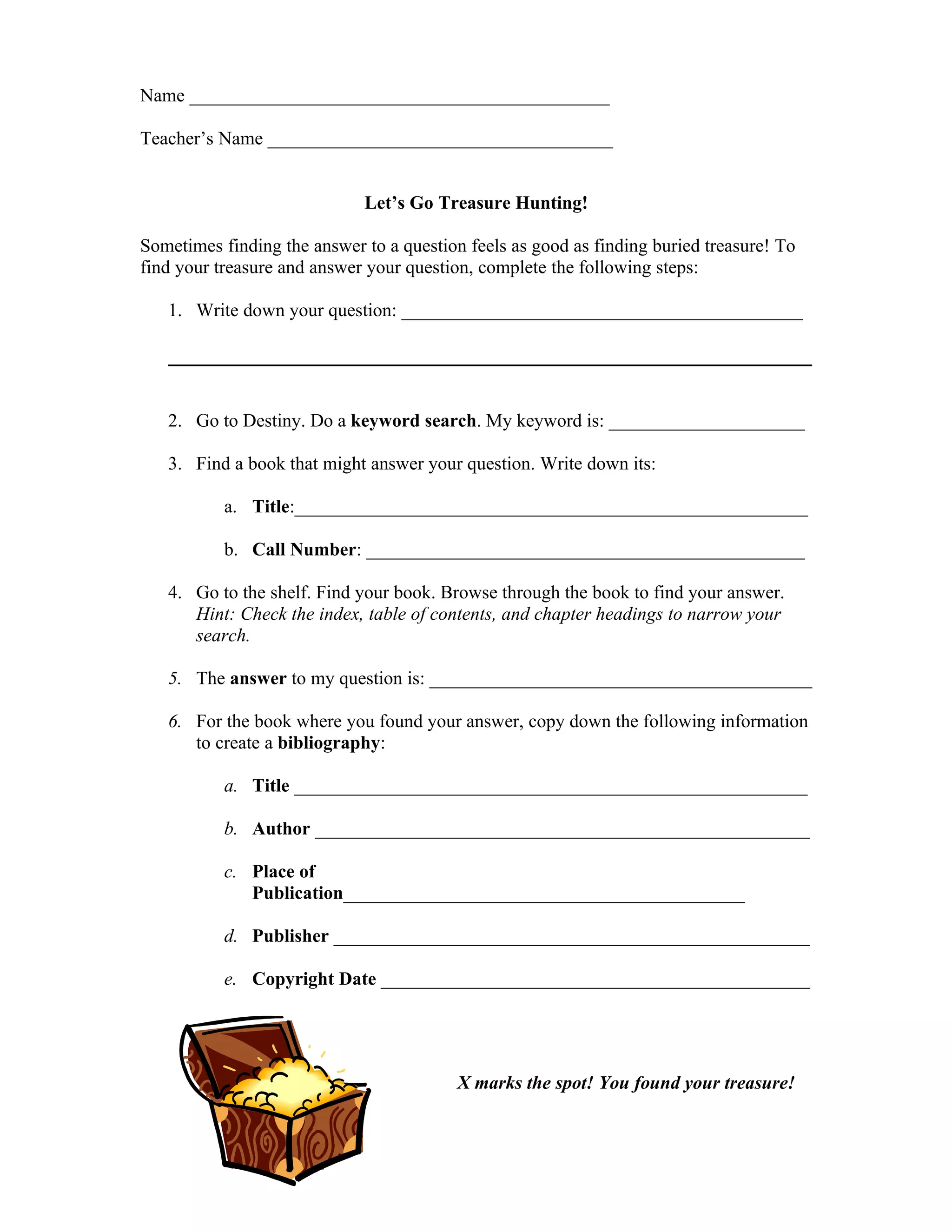 This document provides instructions for students to go on a treasure hunt to find the answer to a question. It instructs students to write down their question, search the library catalog to find a relevant book, locate the book on the shelf using the call number, browse through the book to find the answer, and record bibliographic information about the source book. The goal is for students to feel a sense of discovery, like finding buried treasure, in answering their question by completing the guided research steps.