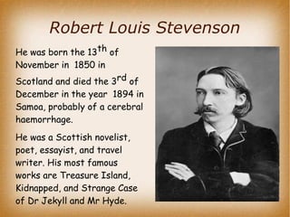 Robert Louis Stevenson was a famous Scottish novelist born in 1850 who wrote many classic works, including Treasure Island. Treasure Island tells the story of young Jim Hawkins, who finds a map to buried treasure and goes on an adventure-filled treasure hunt aboard a ship called the Hispaniola, but encounters danger from the ship's mutinous crew led by Long John Silver who want to steal the treasure for themselves. After many twists and turns, Jim and the loyal crew are eventually rescued and make it back home, while Ben Gunn who also sought the treasure buys a house near Jim's inn.