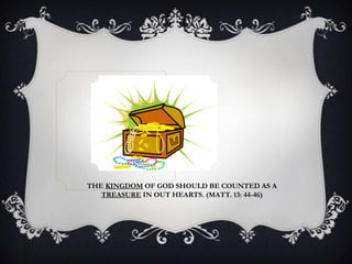 A life that treasures Christ is evidenced by three things: having no fear, steadfastness in faith, and a willingness to suffer for Christ. The document provides biblical examples of people who demonstrated each of these, such as Peter not fearing imprisonment and Paul enduring suffering for the gospel. It is important for Christians to treasure Christ because he first treasured us by choosing and redeeming us as his people.