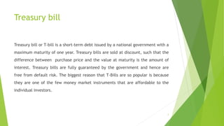 Treasury bills are short-term debt instruments issued by the Bangladesh government with maturities of up to one year. They are sold at a discount to their face value at maturity, with the difference representing the interest earned. Treasury bills carry essentially no default risk since they are guaranteed by the government. Major banks and non-bank financial institutions in Bangladesh participate as primary dealers in the treasury bill auction process managed by the central bank.