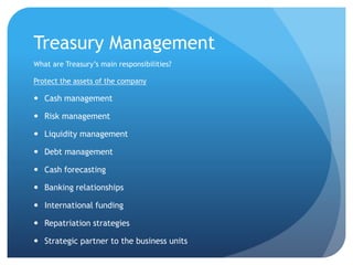 The document discusses the centralization vs decentralization of treasury management. It outlines the main responsibilities of treasury as protecting company assets through cash management, risk management, liquidity management, and other functions. It notes benefits of both centralized and decentralized models, with centralization allowing for economies of scale, cost reduction, and risk visibility, while decentralization allows for flexibility and local market knowledge. Factors that influence the choice include management attitude, company situation, growth, and technology. Overall, companies have increasingly centralized treasuries for better control, efficiency, and visibility, though standardization globally remains a challenge due to regulatory differences.