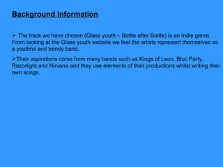 The music video will represent the band as a young, trendy indie band inspired by groups like Kings of Leon and Nirvana. It will tell the narrative of a man struggling with alcohol addiction through shots of his isolated home life, showing how alcohol negatively impacts families. The video will include both performance shots of the band on a stage and narrative scenes portraying the man hitting rock bottom with his drinking and deciding to get sober and repair his family relationships.
