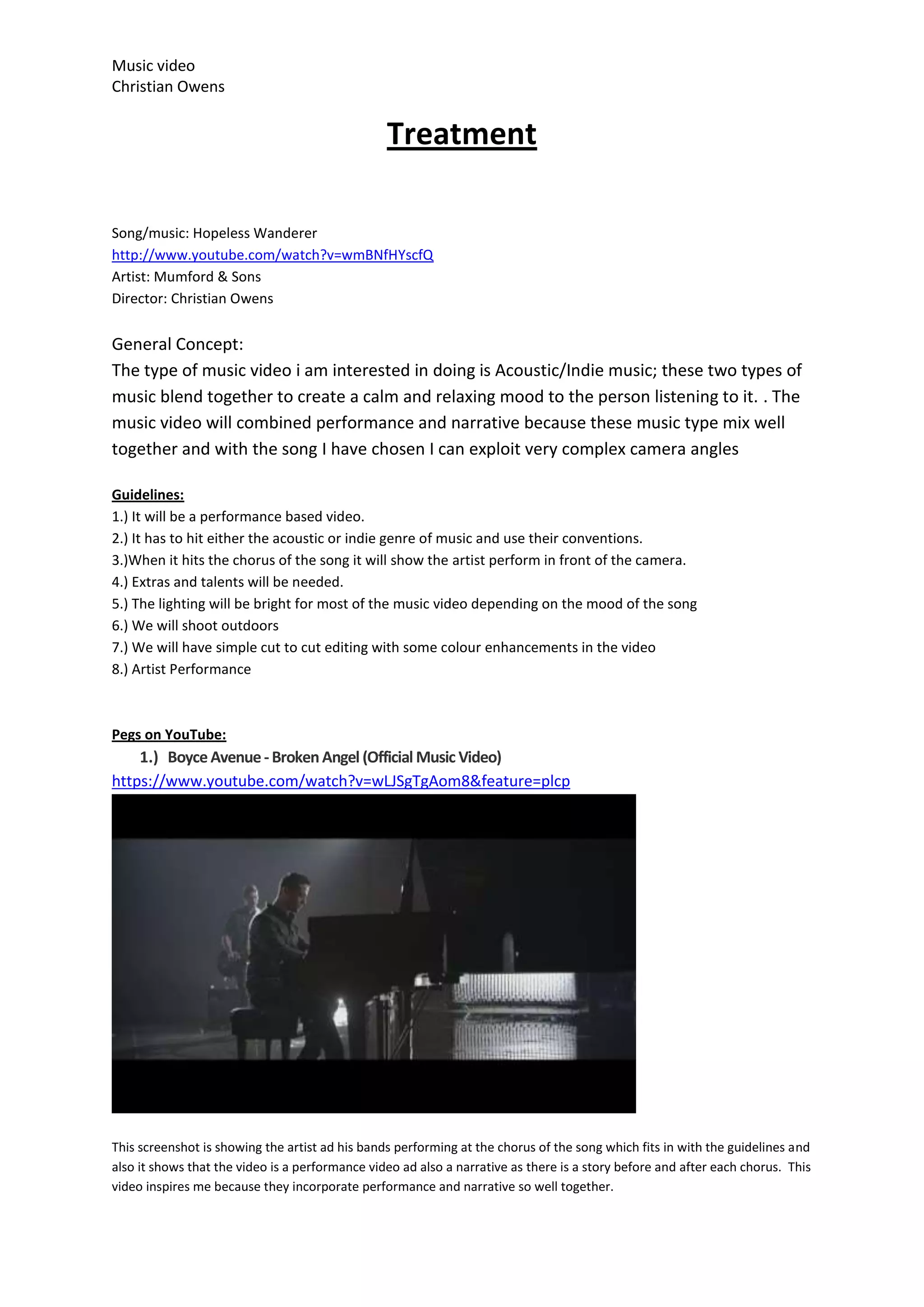 The document outlines Christian Owens' proposal for a music video for the song "Hopeless Wanderer" by Mumford & Sons. It will tell the narrative story of a character who wanders through the woods playing his guitar to forget family problems, intercut with performances of the band. The video will be shot outdoors on location over three days in February, following guidelines of being a performance-based indie/acoustic genre video with natural lighting and color enhancements.