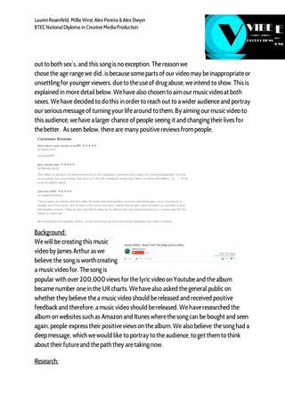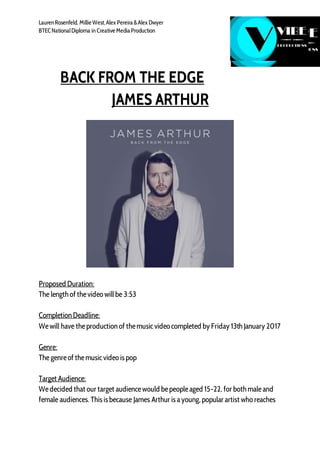 - The proposed music video is for James Arthur's song "Back from the Edge" and will be 3 minutes and 53 seconds long. It must be completed by January 13, 2017.