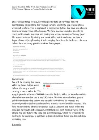 - The video will have a pop genre and target audience of 15-22 year olds of both sexes to convey the serious message of turning your life around.