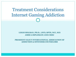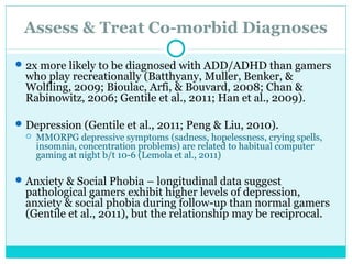 The document discusses treatment considerations for internet gaming addiction, noting that individuals with this addiction are often more likely to experience co-morbid diagnoses such as ADHD, depression, and anxiety. It outlines various theoretical models of video game addiction, including factors contributing to its development and persistence, such as personality traits, motivation, and structural characteristics of online games. Prevention and treatment strategies are provided, emphasizing the importance of engaging support systems, monitoring gaming behavior, and professional interventions.