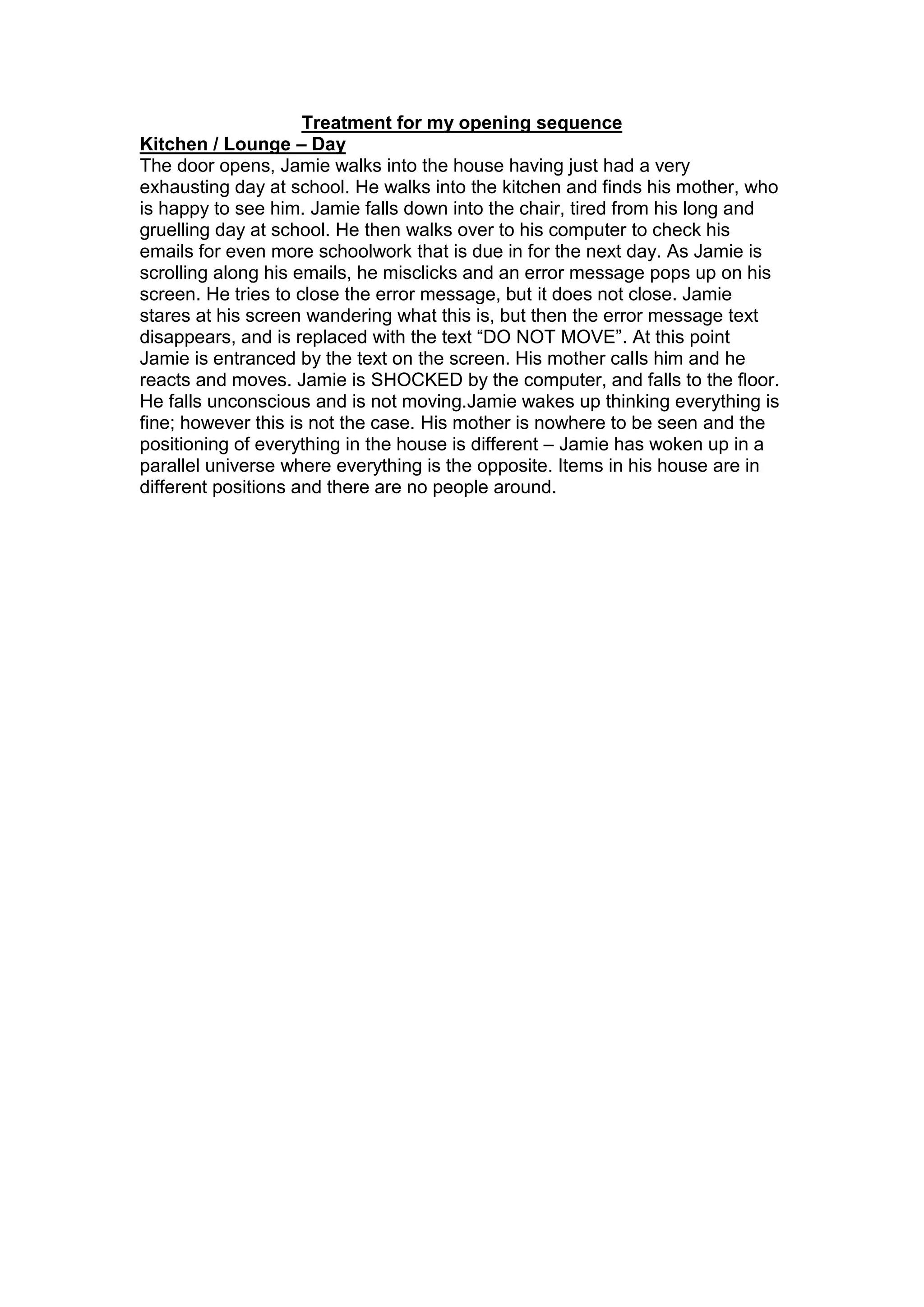 Jamie comes home from school exhausted and falls into a chair in the kitchen. He checks his emails on the computer and an error message appears. The message says "DO NOT MOVE" and entrances him. When his mother calls him, he reacts and moves, shocking him. He falls unconscious on the floor. Jamie wakes up thinking all is well, but finds his mother gone and everything in the house repositioned. He realizes he has woken up in a parallel universe where everything is opposite.