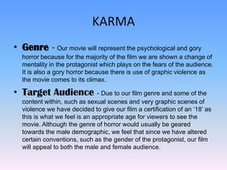 The document provides details on the plot, style, and logistics for a horror film trailer titled "Karma". It describes the psychological horror genre and graphic violence. It outlines using fast editing, props like knives and blood, and changing the protagonist's mentality to portray the horror. Locations like a house, field, and basement will be used for filming with actors portraying the main characters.