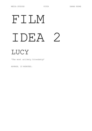 This document contains a pitch for a short film called "Lucy" about an 11-year-old lonely girl named Lucy who befriends a 19-year-old man named Harry. Lucy meets Harry one day in an abandoned bunker in the forest near her home. They spend each day together for a week, though no one believes Lucy when she tells them about Harry. In the end, Lucy is unable to find Harry in the bunker again and discovers graffiti from 1941, implying that Harry was a soldier who has passed away, leaving it ambiguous if he was real or a figment of Lucy's imagination.