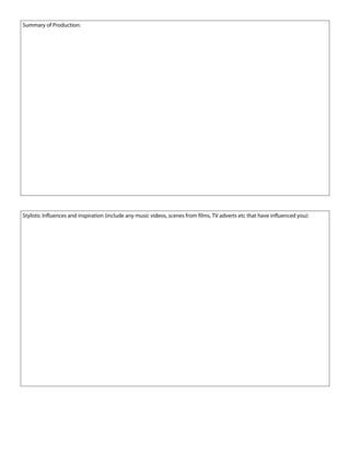 The document is a production treatment for a music video by the band Orphan Songs. It outlines plans to film in a wooded location on December 3rd, starting at 8am and filming until 5pm. Special effects will involve pinning leaves to the subject and compositing two shots of someone sitting on a bench to imply an imagined person. The video aims to be inspired by Michel Gondry's visual style and OK GO's innovative use of timelapse. Camera and tripod equipment is needed on the scheduled filming date.