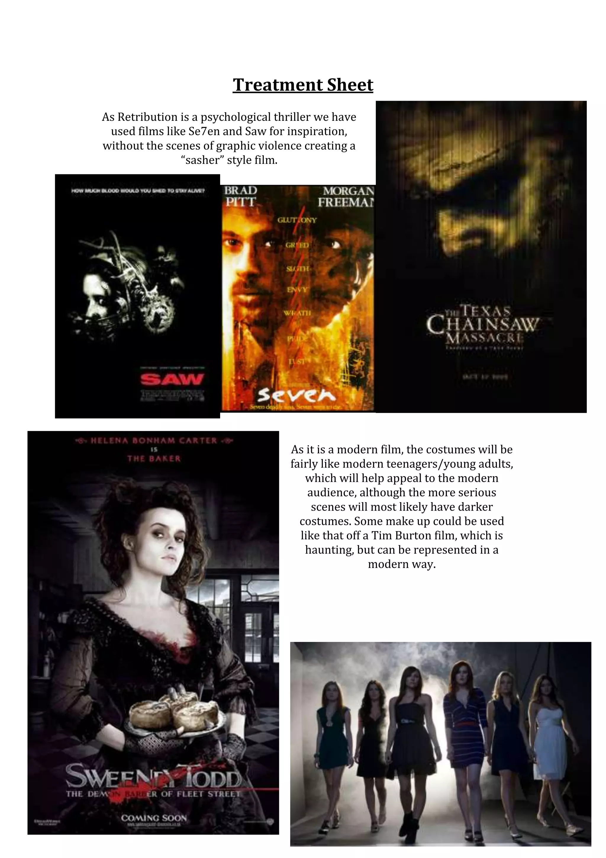 This treatment sheet discusses the inspiration and style for a psychological thriller called As Retribution. It takes inspiration from films like Se7en and Saw but without graphic violence, creating a "sasher" style film. It also notes that the costumes will resemble modern teenagers to appeal to modern audiences, though more serious scenes may be darker, and makeup could be inspired by Tim Burton films in a haunting but modern way.