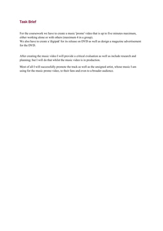 For thecoursework we have to create a music 'promo' video that is up to five minutes maximum,
