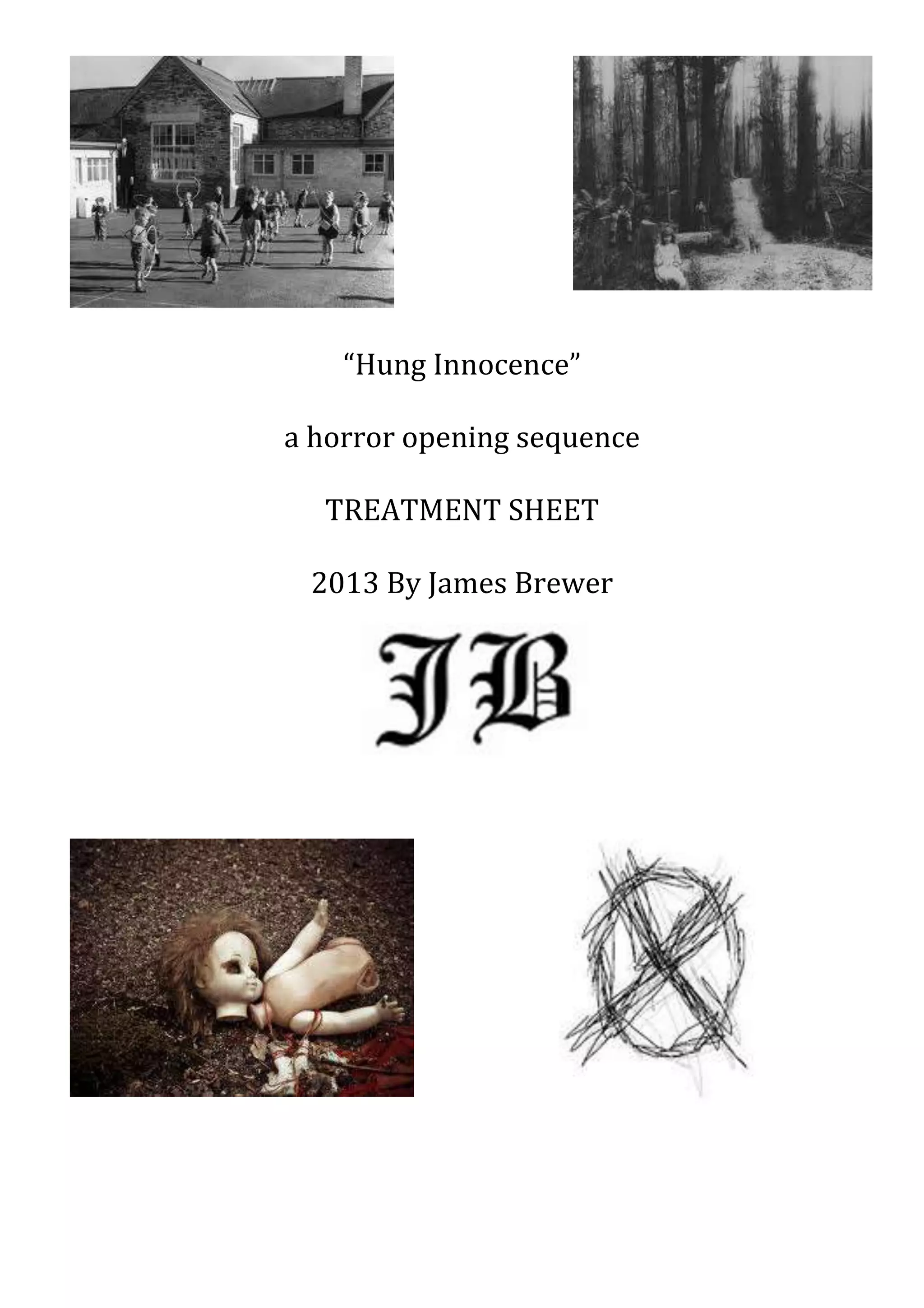 This document provides details for the opening horror sequence of a short film titled "Hung Innocence". It includes a cast list, overview, and outline for the sequence. The sequence will show children playing in a park being watched by Slender Man. It then cuts to the decay of the children's toys and photos over time. The children will walk obediently towards Slender Man and disappear. Later, parents are shown grieving while posters of missing children from decades past line the walls. The sequence ends with skeletons and corpses found at the base of a tree, including a young girl hanging from it.