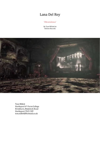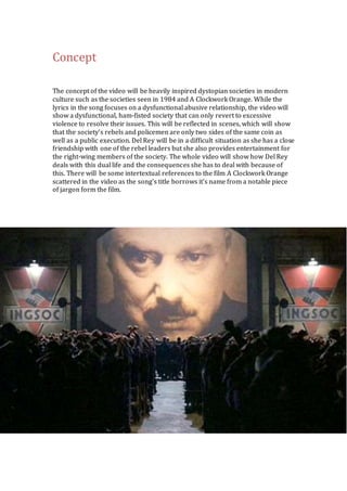 This document provides a concept summary and production plan for a music video to accompany Lana Del Rey's song "Ultraviolence". The proposed video will tell a dystopian narrative set in a dysfunctional society inspired by 1984 and A Clockwork Orange. It will focus on Del Rey's character who is torn between her friendship with a rebel leader and her role providing entertainment for the society's elite. The video will use symbolic imagery and examine human traits like greed, murder, and love to critique the negative aspects of human nature exaggerated in this world. It will incorporate varied camera shots and lighting to set the atmosphere and emphasize important story beats through its editing.