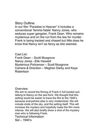 Frank Dean, a mysterious gangster on the run from the law for murder, is seduced by Nancy Jones. The film aims to record a scene of Frank and Nancy talking on the seaside front to establish the 1940s setting. Key details include costumes from the 1940s era, props like cigarettes and drinks, and filming at the seaside front in Seaham over the course of approximately 2 minutes.