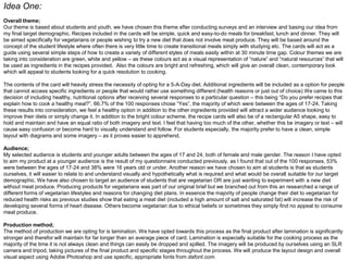 Idea One proposes recipe cards for students aged 17-24 with quick, easy vegetarian meals. The cards would use bright colors and include nutritional information and substitutions. They would have a clean layout balancing images and text for simplicity.