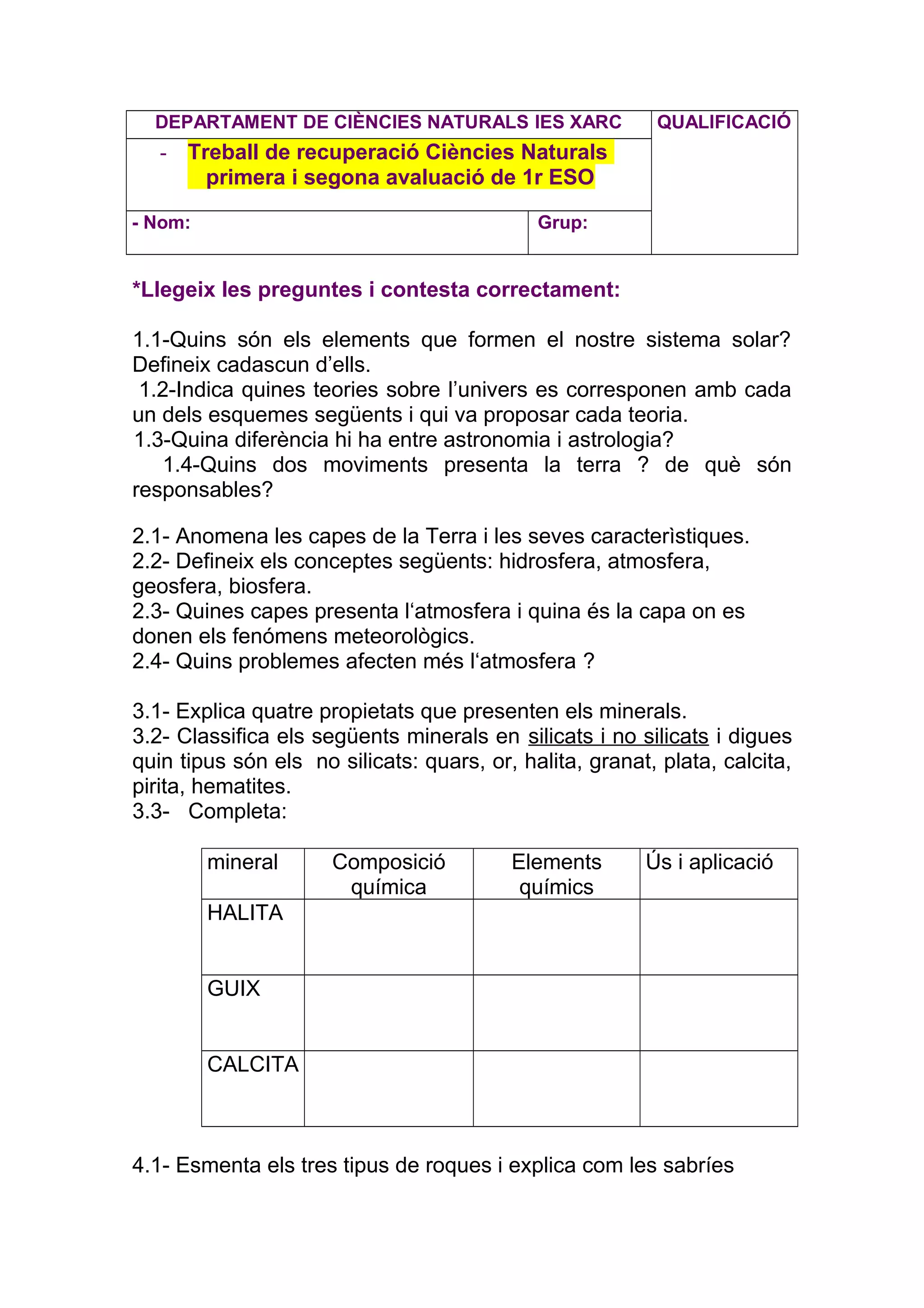 - Treball de recuperació Ciències Naturals