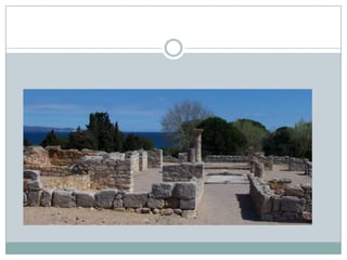 Empúries, va serdurant molts segles l'assentament de poblacions gregues-en un primer moment-i romans. Actualment pertany al territori espanyol. Els romans l'anomenaven Emporion que traduïda significa magatzem comercial, i precisament va ser aquesta la seva principal funció mentre que grecs i romans convivien a la ciutat. El seu origen data de finals de l'Edat de Bronze i principis de l'Edat de Ferro amb poblacions de la cultura dels indigets que van deixar com a testimoni del seu pas per Empúries el Jaciment d'Ullastret. En un principi aquest poble ibèric tenia una economia de subsistència, fet que canviaria substancialment amb l'arribada dels grecs amb qui començarien a comerciar i intercanviar béns de consum per preuades mercaderies com el vi.