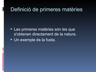 matèries Les primeres matèries són les que s'obtenen directament de la natura. Un exemple és la fusta .