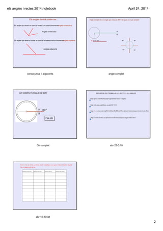els angles i rectes 2014.notebook 2 April 24, 2014 consecutius i adjacents Els angles també poden ser... Angles consecutius Angles adjacents Els angles que tenen en comú el vèrtex i un costat s'anomenen angles consecutius. Els angles que tenen el costat no comú a la mateixa recta s'anomenen angles adjacents. angle complet Angle complet és un angle que mesura 360º i és igual a un gir complet A BO A O B = 360º 90º 90º 90º 90º Gir complet A B 360 º Fes clic GIR COMPLET (ANGLE DE 360º) abr 220:10 RECURSOS PER TREBALLAR LES RECTES I ELS ANGLES http://prezi.com/0ozihc23pt1i/geometriarectesiangles/ http://clic.xtec.cat/db/act_ca.jsp?id=3111 http://www.xtec.cat/ceipflix/LoRacoDelCloret/03cs/primer/matematiques/rectes/rectes.htm http://www.edu365.cat/primaria/muds/matematiques/angle/index.html abr 1610:38 ARBRES FRUITERS ANGLES RECTES