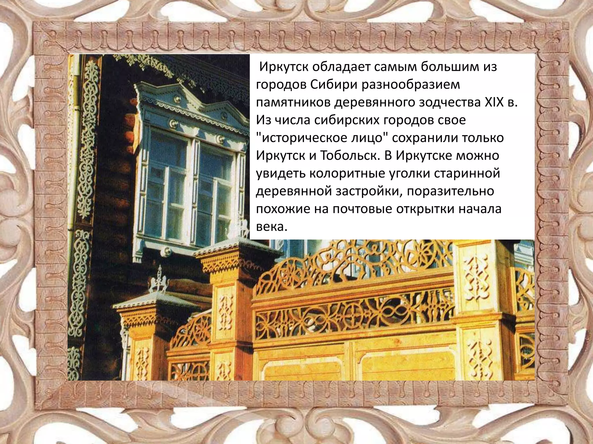 Иркутск, обладая богатым наследием деревянного зодчества XIX века, сохранил уникальные примеры исторической архитектуры. Проект по созданию нового городского пространства 'исторического1 30-го квартала' направлен на сохранение и восстановление архитектурного наследия города. Усадьба Сукачева и другие памятники демонстрируют высокий уровень искусства декора и важность сохранения исторического облика Иркутска.