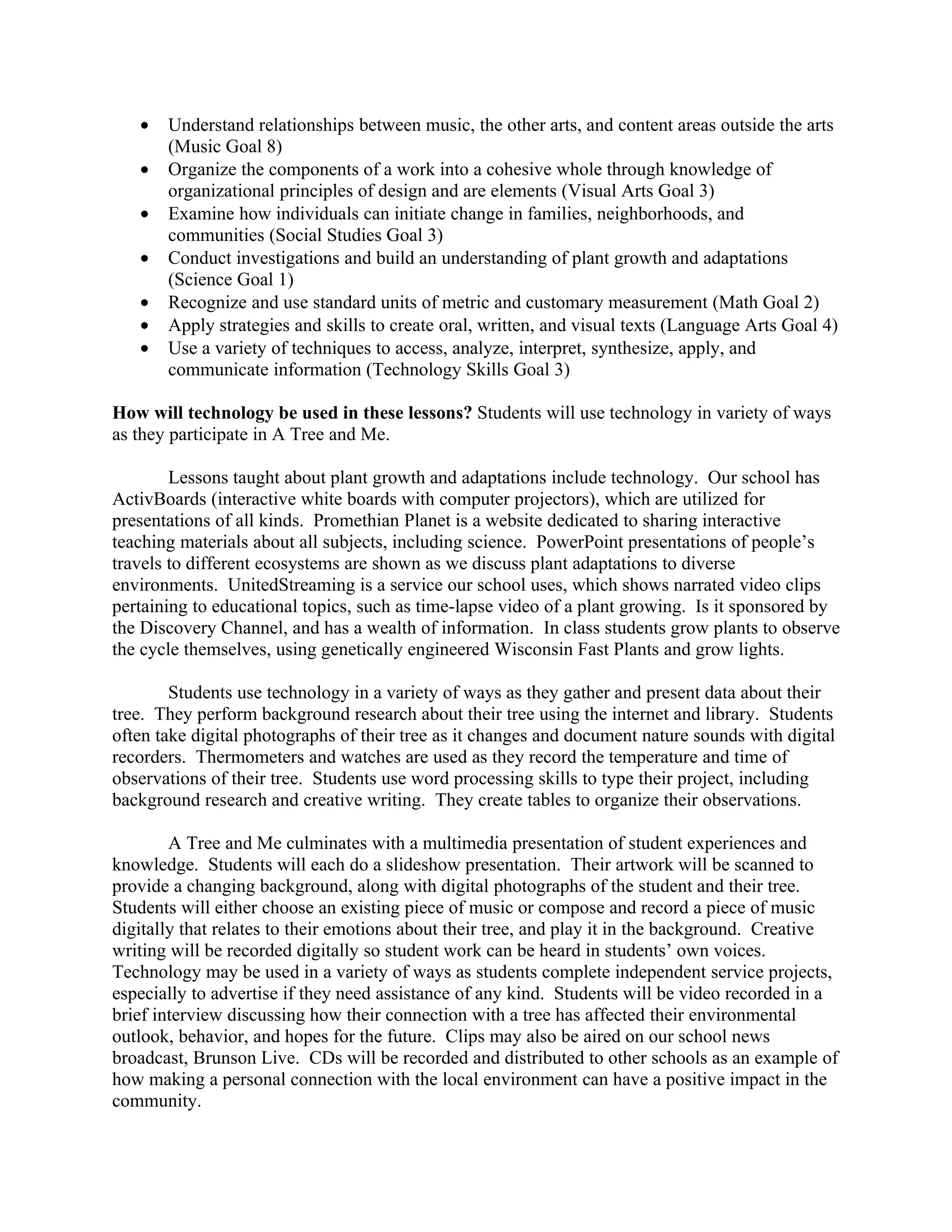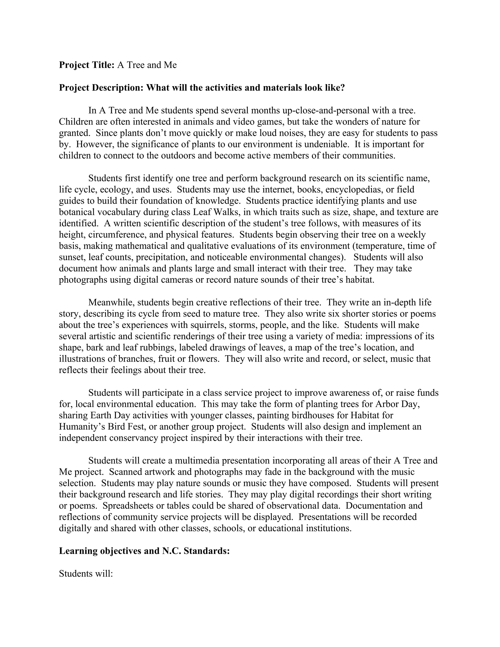 Students will spend several months observing and studying an individual tree to learn about plant life cycles, ecology, and the importance of environmental stewardship. They will record weekly observations of their tree, write stories from the tree's perspective, and create artistic representations of their tree. Students will also complete a community service project related to local conservation efforts. Finally, students will create a multimedia presentation incorporating their research, writings, artwork, and reflections on connecting with nature to share what they've learned.